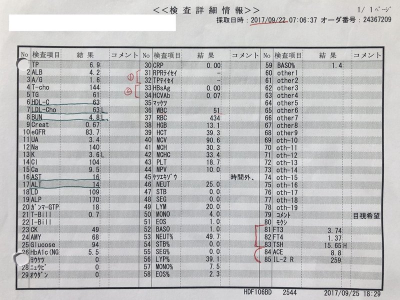 総合病院へ入院した時の血液検査表も持っていきました。これから行かれる方も直近の健康診断などの血液検査表を持っていかれると先生から色々聞けるので持っていくことをお勧めします。