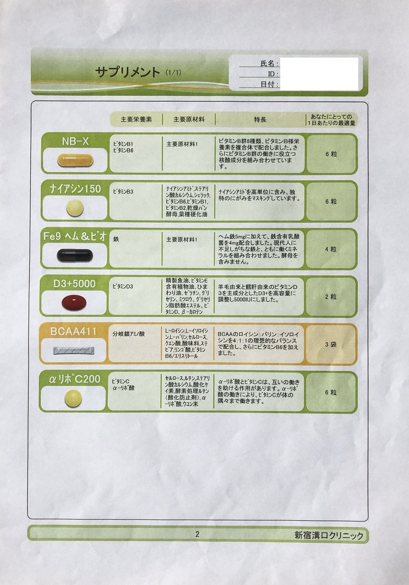 採血が終わり、待合室で少し待ってから別の個室でオーソモレキュラーの資格を持ったカウンセラーさんから先生から処方されたサプリメントの説明や飲み方を聞きます。 この日はまだ詳細な血液検査結果が出ていないので、明らかに必要であろうサプリメントが処方されました。
